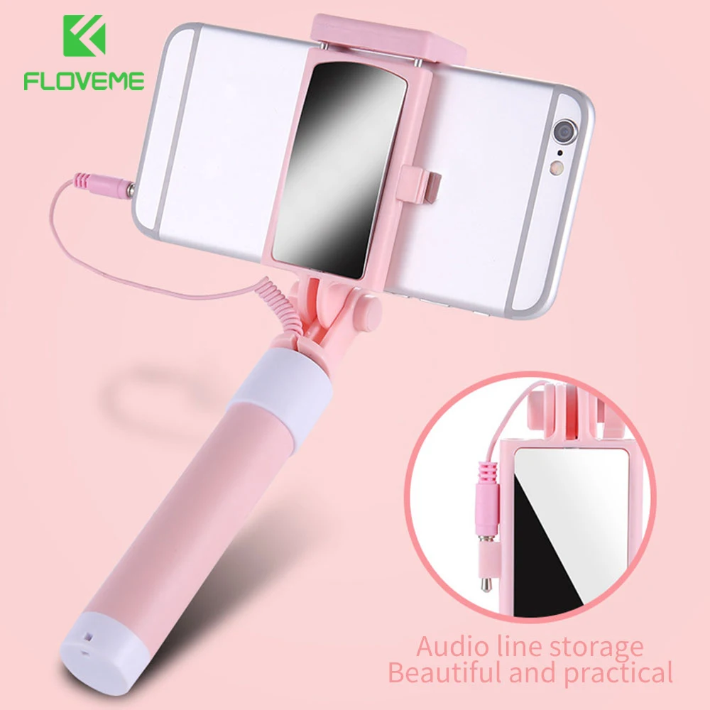FLOVEME-Mini palo de Selfie con cable, trípode plegable, monopié, palo para selfies con espejo, de mano, 3,5mm, Control de línea de Audio para IOS y Android vino después de 16 días, se parece a las piezas originales, gracias